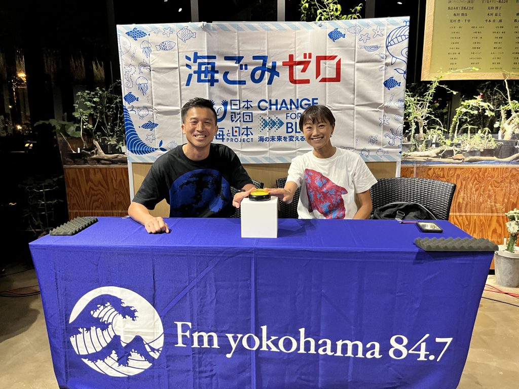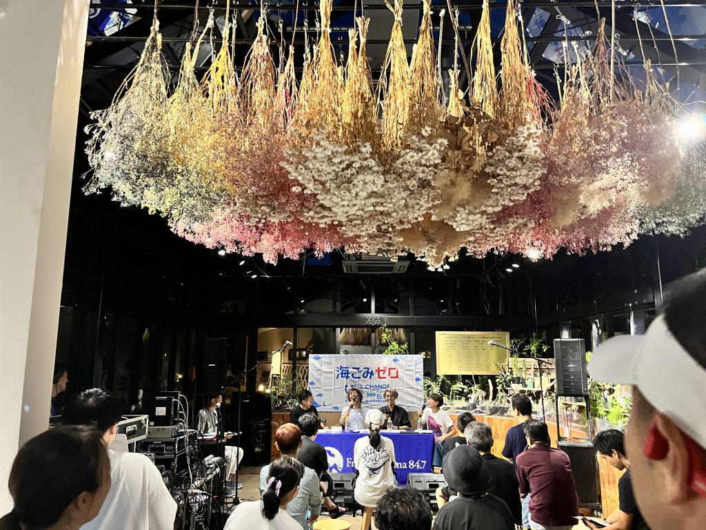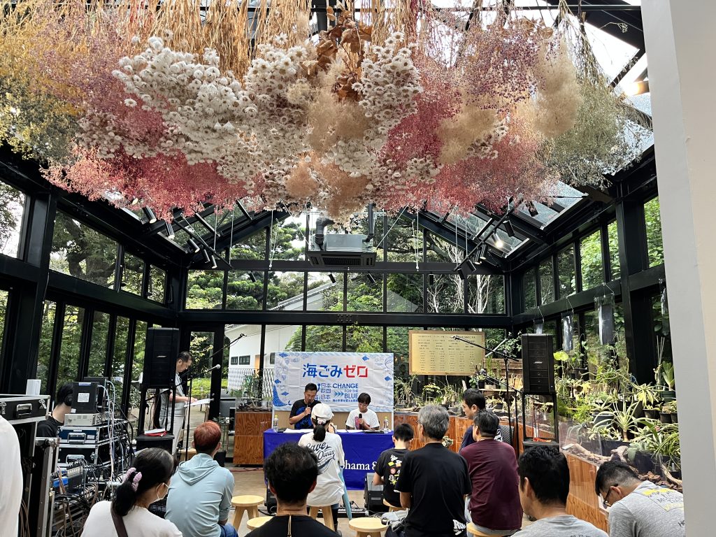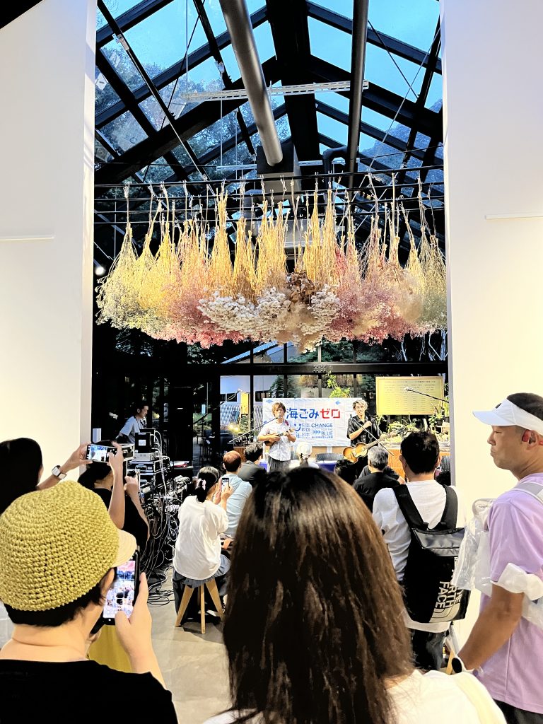 夏の酷暑がひと段落した9月20日土曜日。ガラス張りの会場には、明るい日差しが届く16時から、柴田聡さん、福島和可菜さんのツインDJで生放送がスタート! 会場には、この日15時30分から江の島のお膝元の片瀬東浜海岸でのビーチクリーンに参加くださったリスナーの皆さんも駆けつけてくれました。