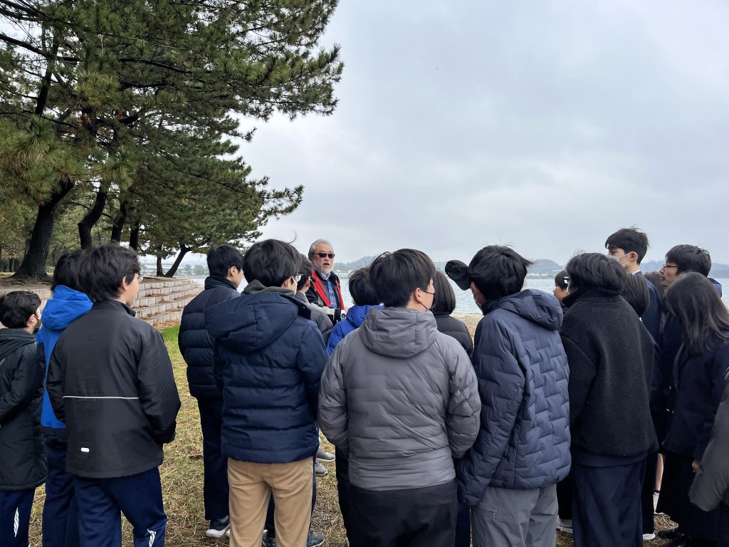 この日は、冬空の下、野島海岸(乙舳海岸)で海洋プラスチックごみやマイクロプラスチックの観察からスタート。