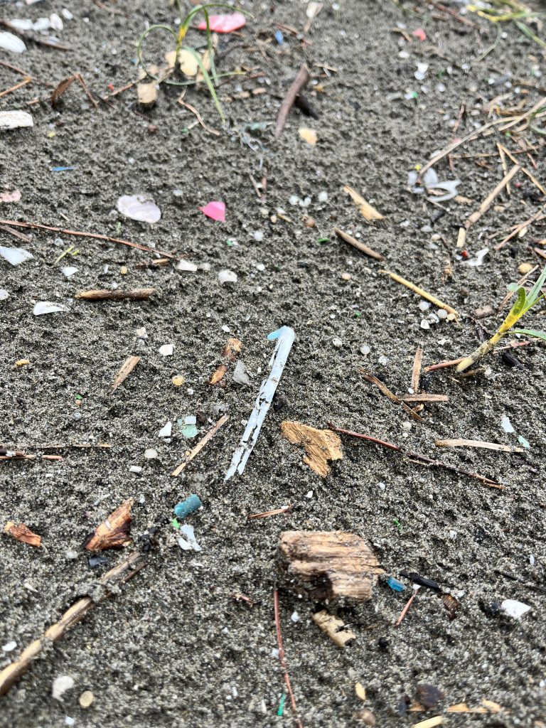 海岸で講師の坂本さんからこの海岸の特性や、どんなマイクロプラスチックが多いのかなどのお話を聞き、砂浜を観察。この日は前日からの雨、そして満潮の時間という事もあり、海岸には多くのゴミが流れついていました。