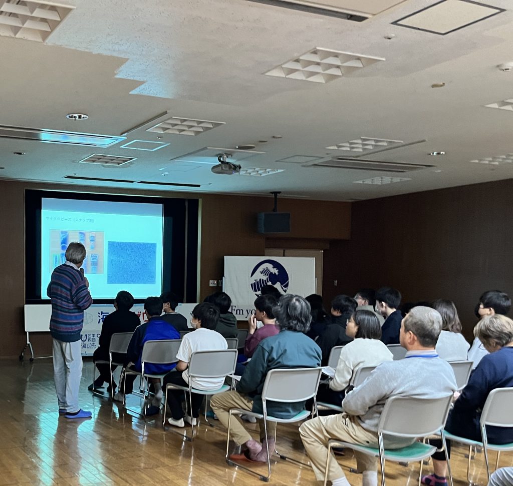 大きなプラスチックごみは拾えますが、小さくなってしまったマイクロプラスチックを取り除くのはとても難しい作業です。その後、「横浜市立野島青少年研修センター」の部屋にて、坂本さんによる講義を受けました。